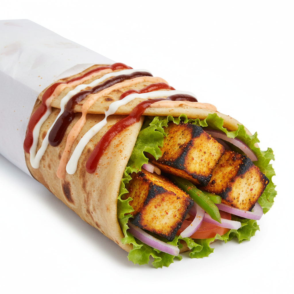 Soft, marinated paneer grilled to perfection and wrapped in a fresh, warm roll with crisp veggies and signature sauces. Smoky, rich, and made fresh to order for a hearty, satisfying bite.