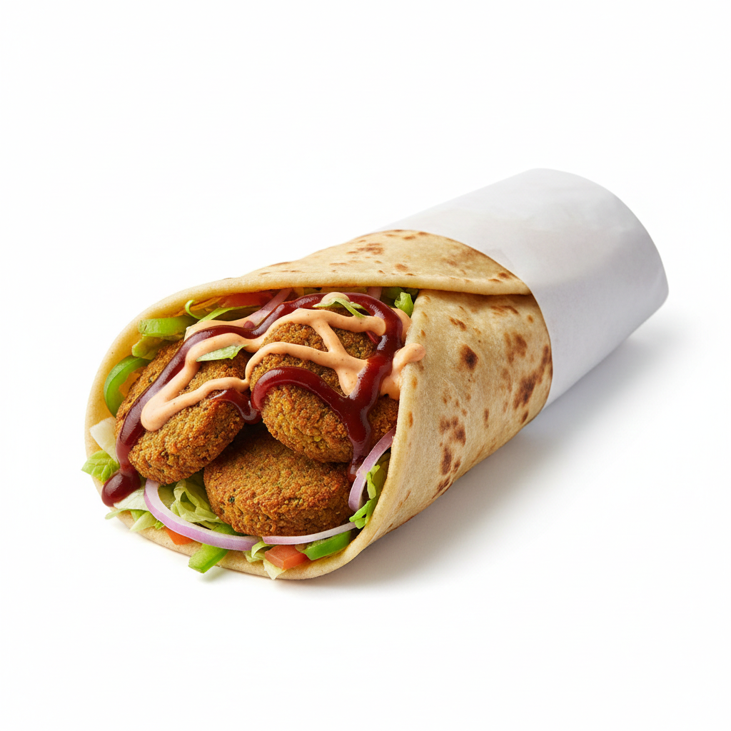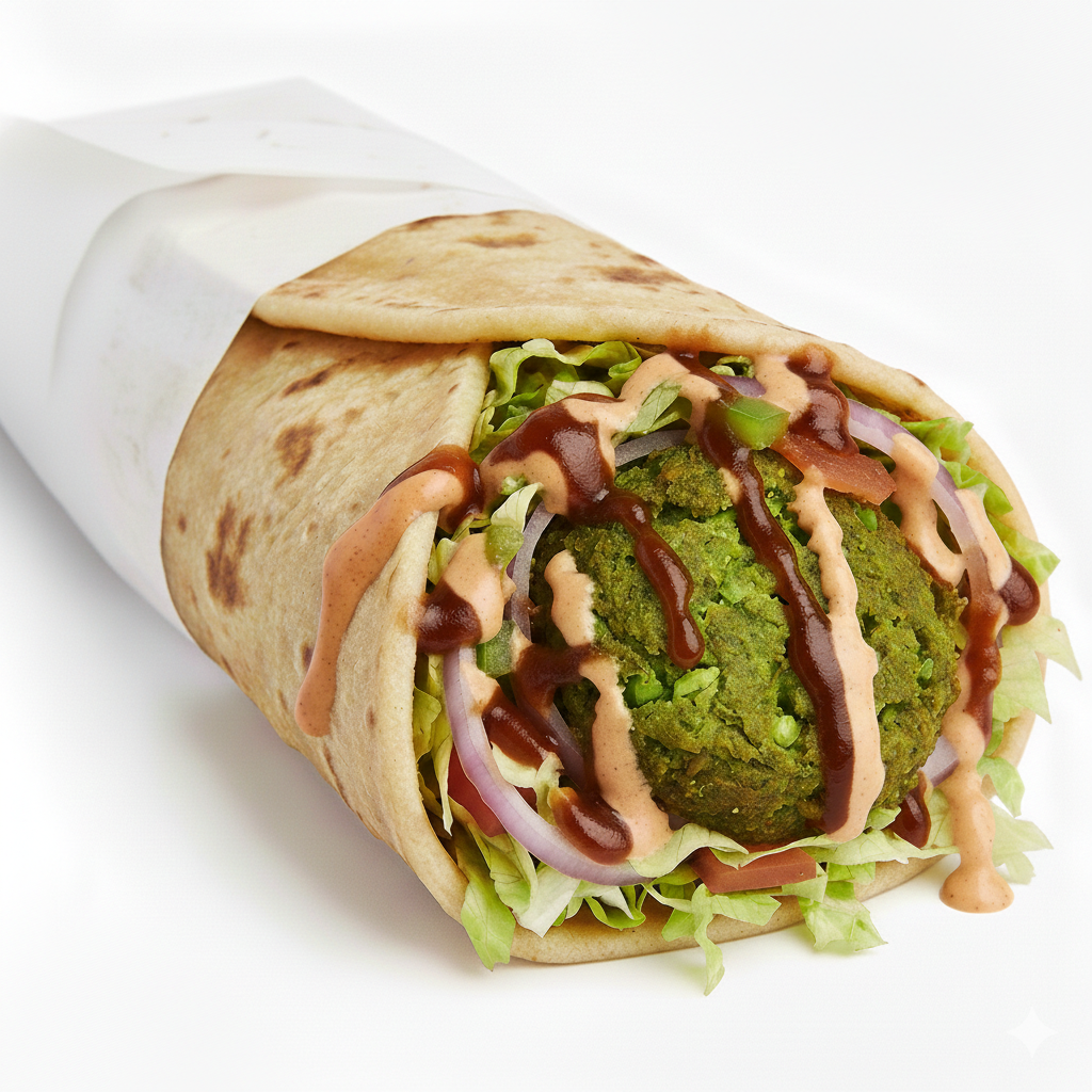 Crispy, golden falafel wrapped in a soft, freshly baked roll with fresh veggies and signature sauces. Crunchy, flavorful, and made fresh to order for a perfectly satisfying veg bite.